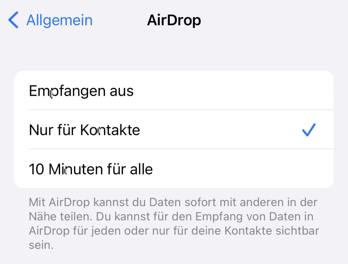 Demnach kann man AirDrop fortan nicht mehr dauerhaft für jeden aktiviert lassen. Ist die Option aktiv, können auch weiterhin alle in Reichweite verfügbaren Geräte Daten, Fotos, Videos und mehr per AirDrop senden. Nach dem Zeitfenster von 10 Minuten wechselt AirDrop automatisch zur Option „Nur für Kontakte“. Ich persönlich finde die Umstellung akzeptabel, immerhin wird so verhindert, dass man unerwünschte Fotos geschickt bekommt, nur weil man die Einstellung nicht wieder umgestellt hat.