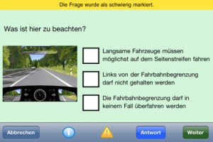 iFührerschein bietet dem Nutzer natürlich die Möglichkeit sich auf die schriftliche Prüfung vorzubereiten. Dabei gibt es einen Lernmodus, in dem man alle Fragen beantworten muss, allerdings kann man sich auch bei falscher Antwort eine Erklärung anzeigen lassen oder die Frage als „schwierig“ markieren. Der Prüfungsmodus ähnelt der richtigen Prüfung. Nach Abschluss kann der Test natürlich ausgewertet werden.