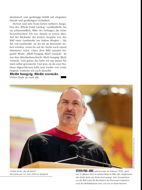 Doch es dreht sich nicht alles um die Vorhersage der Mayas, für die der Weltuntergang übrigens schon dreimal stattgefunden hat. Ein ausführliches Kapitel befasst sich mit der berühmten Rede von Steve Jobs an der Stanford Universität 2005 – es handelt sich letztlich um eine komplette Übersetzung, die man sich auf jeden Fall durchgelesen haben sollte.