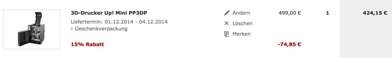 Was vor einigen Monaten noch ein richtig teurer Spaß war, ist mittlerweile auf einem preislich erträglichen Niveau angekommen. Dafür sorgt auch Tchibo, denn dort wurde heute zum ersten Mal ein 3D-Drucker in das Sortiment aufgenommen – der PP3DP UP! Mini. Mit 499 Euro ist er bereits eine deutliche Ecke günstiger als im Preisvergleich (649 Euro). Zudem erinnern wir uns an den aktuellen 15 Prozent Gutschein, den man für eine Anmeldung zum Niveau-Newsletter bekommt. Mit zwei Klicks spart man so nochmal 75 Euro.