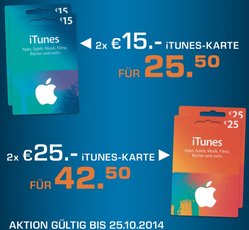 Beim Kauf gibt es einige Details zu beachten, die grundlegenden Infos könnt ihr dem Foto aus dem neuen Prospekt entnehmen. Bei zwei iTunes-Karten im Wert von jeweils 15 Euro zahlt man statt 30 nur 25,50 Euro. Zwei iTunes-Karten im Wert von jeweils 25 Euro gibt es zusammen für 42,50 statt 50 Euro.