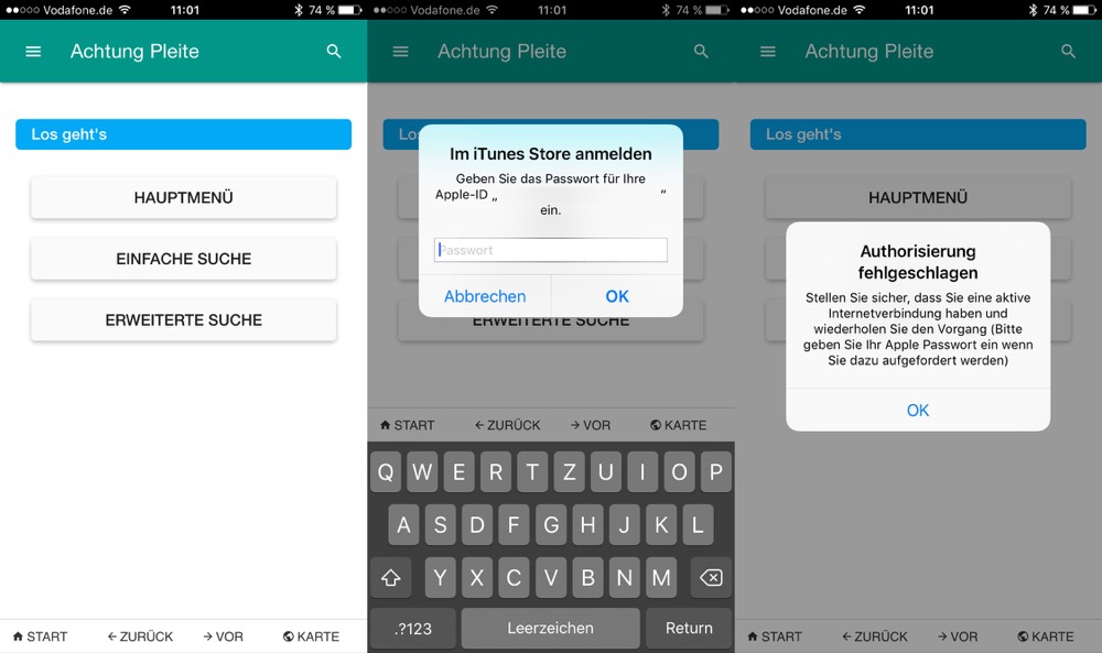 Soweit ist es in unserem Test aber gar nicht gekommen: Nach jedem Fingertipp auf den Suchen-Button erscheint eine Meldung, das Passwort für die Apple-ID einzugeben, obwohl die App bereits vorher zum regulären Preis gekauft wurde. Auch von der bei In-App-Käufen bekannten Touch-ID-Option fehlt jede Spur. Da nicht abzusehen ist, was nach der Eingabe des Passworts mit den Daten passiert, haben wir den Test der ansonsten nutzlosen App an dieser Stelle abgebrochen.