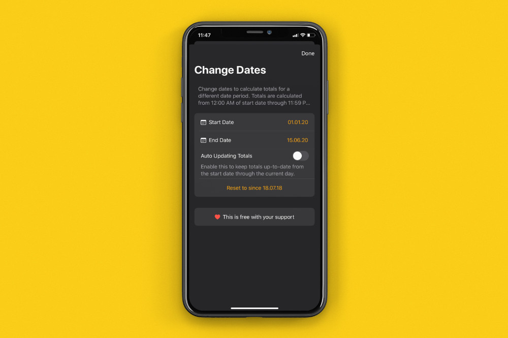 Auf diese Weise ist es beispielsweise möglich, sich Statistiken über eine bestimmte Woche, einen Monat oder ein Jahr in der Vergangenheit anzuzeigen. Wer etwa wissen möchte, wie viele Schritte man während des letzten Städtetrips über mehrere Tage gegangen ist, oder wie viele Kilometer im Jahr 2019 radgefahren wurde, ist mit diesem Feature genau an der richtigen Adresse. Auch zwei neue Datenfelder wurden mit v1.2 in Activity Stats integriert: Die gesamte Raddistanz aus Trainings, sowie die HIIT-Gesamtzeit. Wer den Entwickler unterstützen möchte, findet darüber hinaus jetzt auch eine Möglichkeit, einen kleinen Obolus für die Kaffeekasse zu spenden.