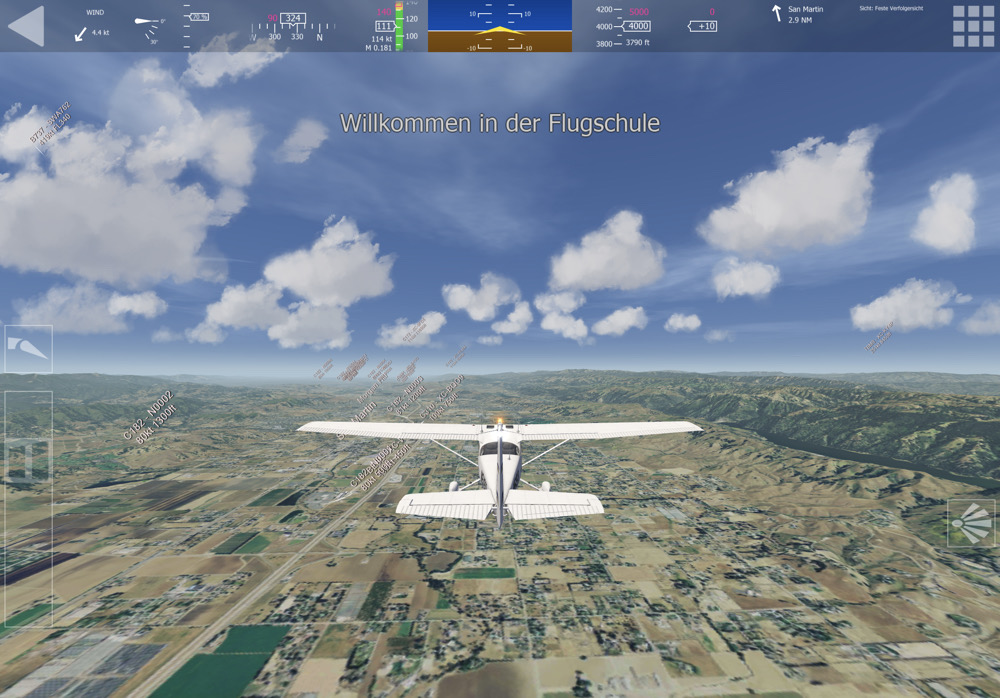In der Flugschule selbst wartet dann ein aus 22 Teilen bestehendes Tutorial, in dem man sich mit der grundlegenden Steuerung und ersten Übungen in der Luft mit dem Flugzeug vertraut macht – um so vielleicht in späteren Schritten auf den Luftverkehr losgelassen zu werden. Erfreulicherweise gibt es hier auch eine in deutscher Sprache geführte Navigation während der Flugübungen durch eine weibliche Stimme. So lernt man nach und nach das Höhen- und Querruder zu bedienen, Kurven zu fliegen und vieles mehr.
