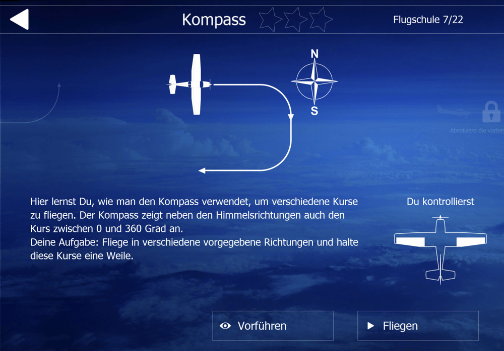 Die Fluglehrerin lässt einer Flugschülerin wie mir dabei nicht alles durchgehen und verteilt im Anschluss an jede Lektion maximal drei Sterne – je nachdem, wie akkurat man die jeweiligen Übungen durchgeführt hat. Und auch an Lob und Tadel lässt Frau Lehrerin nichts vermissen: Von „Perfekt“ bis hin zu „Das kannst du besser“ bekommt man entsprechende verbale Bewertungen der eigenen Flugkünste.