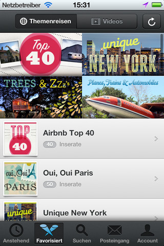 Der Startbildschirm des zuletzt am Donnerstag aktualisierten Airbnb zeigt ausgewählte Favoriten an, zum Beispiel aus Paris, New York oder die weltweiten Top-40. Über eine integrierte Suche kann man natürlich auch nach einem bestimmten Ort suchen oder Unterkünfte in der Nähe der aktuellen Position suchen.