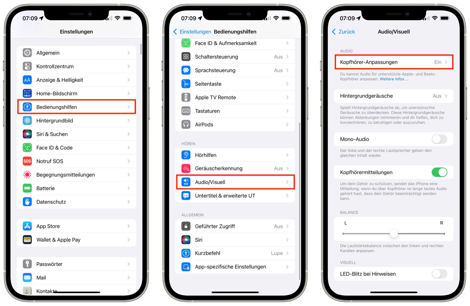 - Audio/Visuell und die Kopfhörer-Anpassungen aktivieren