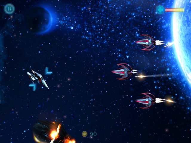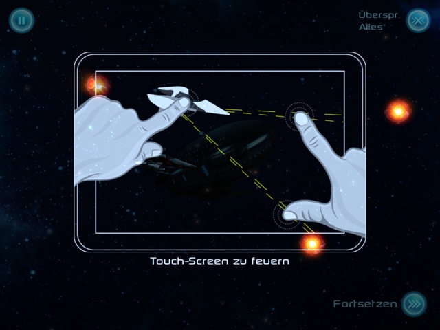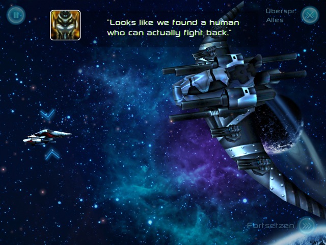 Doch, es ist gewissermaßen auch eine 3rd Person-Perspektive – allerdings steuerst du das Raumschiff nicht über virtuelle Buttons bzw. Joystick, sondern per Touch-Steuerung direkt mit dem Finger über den Bildschirm.