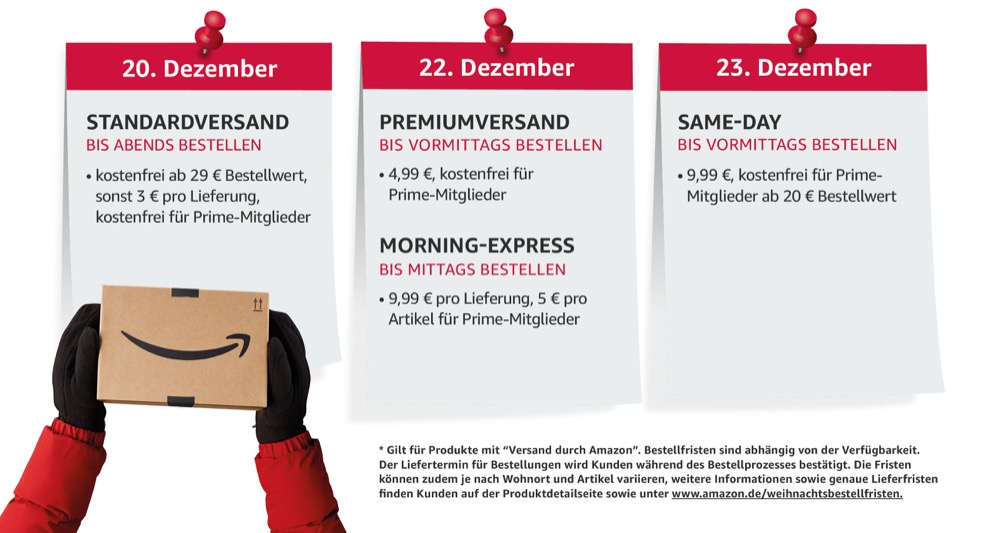 (9,99 EUR pro Lieferung, 5 EUR pro Artikel für Prime-Mitglieder) - 23. Dezember bis vormittags (abhängig von der Metropolregion): Same-Day Lieferung für 20 deutsche Metropolregionen