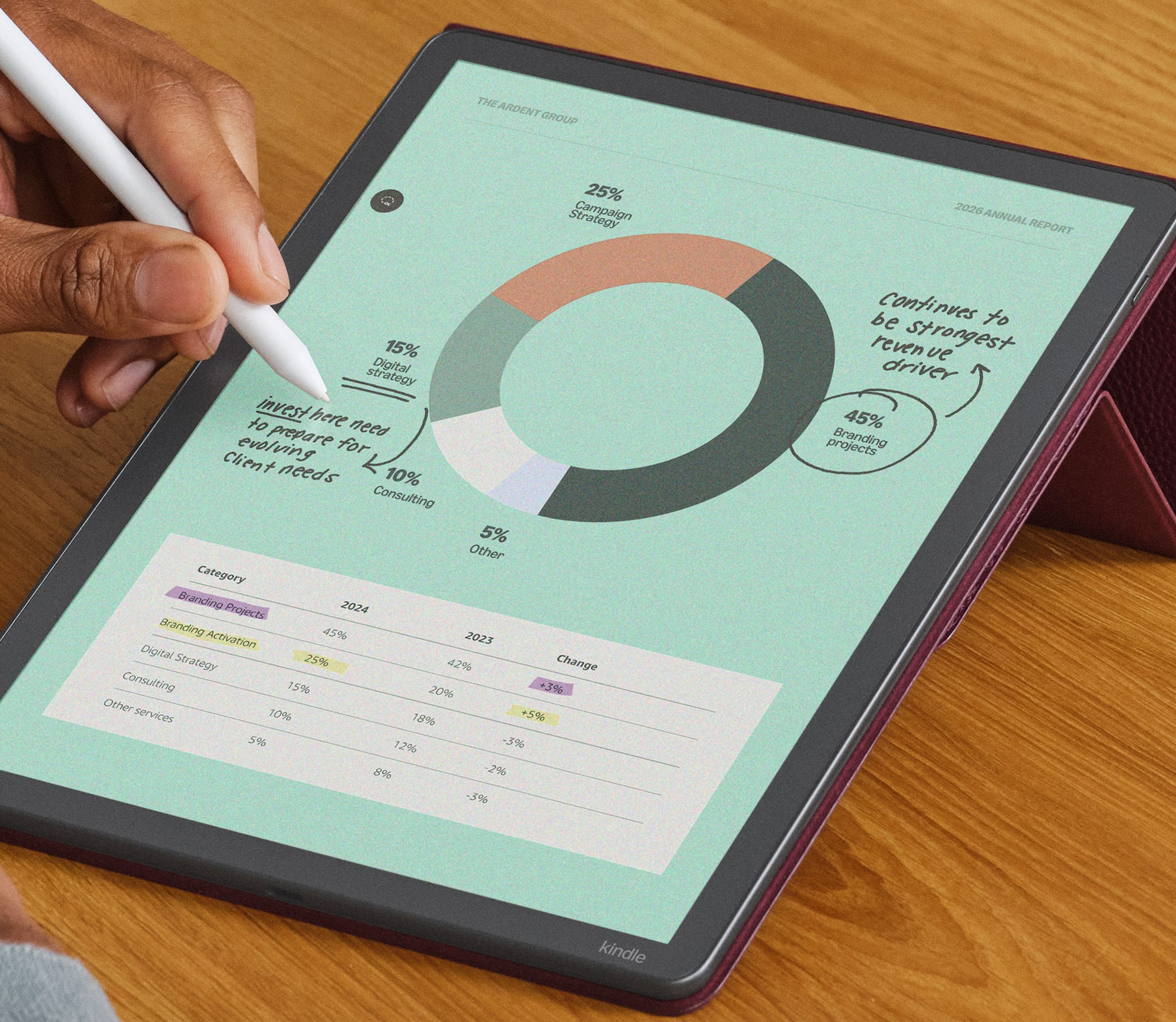 Ein echtes Highlight ist der neue Kindle Scribe Colorsoft, der sich äußerlich kaum vom Standardmodell unterscheidet, aber mit einem farbigen E-Ink-Display ausgestattet ist. Amazons eigene Colorsoft-Technologie sorgt dabei für sanfte, augenschonende Farben – ganz ohne grelle LCD-Hintergrundbeleuchtung. Ein neuer Farbfilter, optimierte Lichtleiter und spezielle LEDs erzeugen natürliche Farbtöne, ohne Details zu verlieren. Eine ebenfalls neu entwickelte Rendering-Engine verbessert die Darstellung und macht das Schreiben in Farbe noch natürlicher und flüssiger. Zehn Stiftfarben und fünf Textmarkerfarben stehen zur Auswahl, ebenso ein neues Schattierungstool, mit dem sich Ideen und Zeichnungen kreativ gestalten lassen.