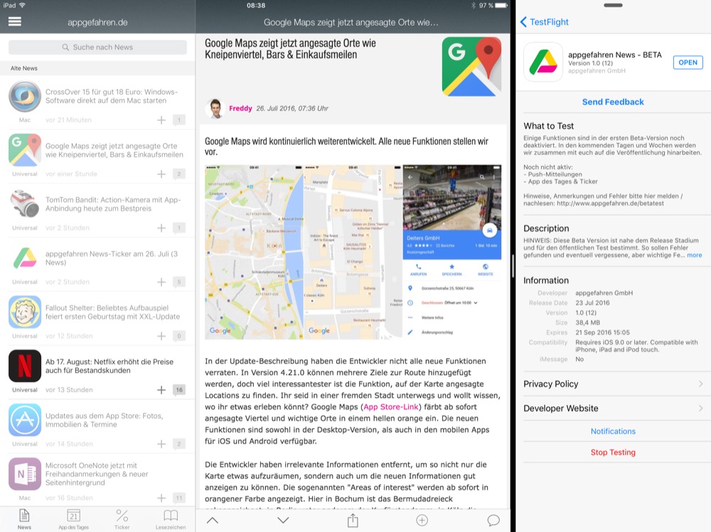 Bitte beachtet, dass es sich nicht um ein kleines Update, sondern tatsächlich um eine komplett neue App handelt – auch wenn sich optisch auf den ersten Blick nicht viel verändert hat. So kann es aktuell noch zu kleineren Fehlern kommen, wenn man beispielsweise aus einer Push-Mitteilung direkt in eine News springen will. Zum Start von iOS 10 werden wir nächste Woche ein erstes Bugfix-Update veröffentlichen, Anfang Oktober folgt dann eine weitere Aktualisierung, die unter anderem eine Anpassung der Schriftgröße nachreicht.