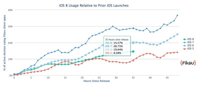 Eine Studie von Fiksu.com zeigt die Verbreitung verschiedenen iOS-Versionen nach dem Start. Im Gegensatz zu iOS 6 und iOS 7 hinkt iOS 8 noch ein wenig hinterher.