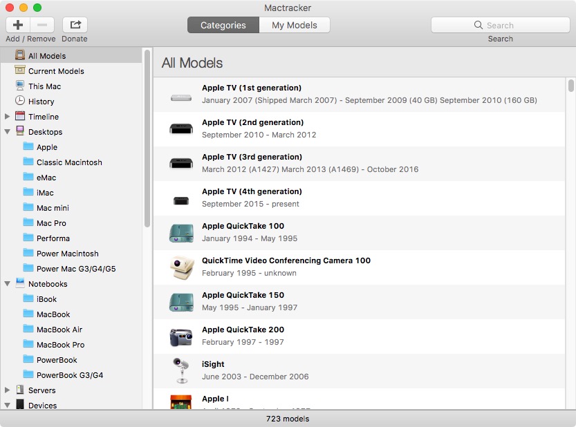 Weiterhin kann man die komplette Datenbank durchsuchen. Ebenfalls gibt es eine Favoriten-Funktion, alle Einträge werden sogar per iCloud mit anderen Geräten synchronisiert. Mit der Kategorie „Current Models“ führt der Mactracker alle aktuellen Modelle auf.