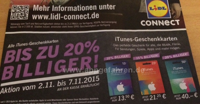 Update am 31. Oktober: Hier noch einmal der Hinweis auf die reduzierten iTunes-Karten bei Lidl in der kommenden Woche.