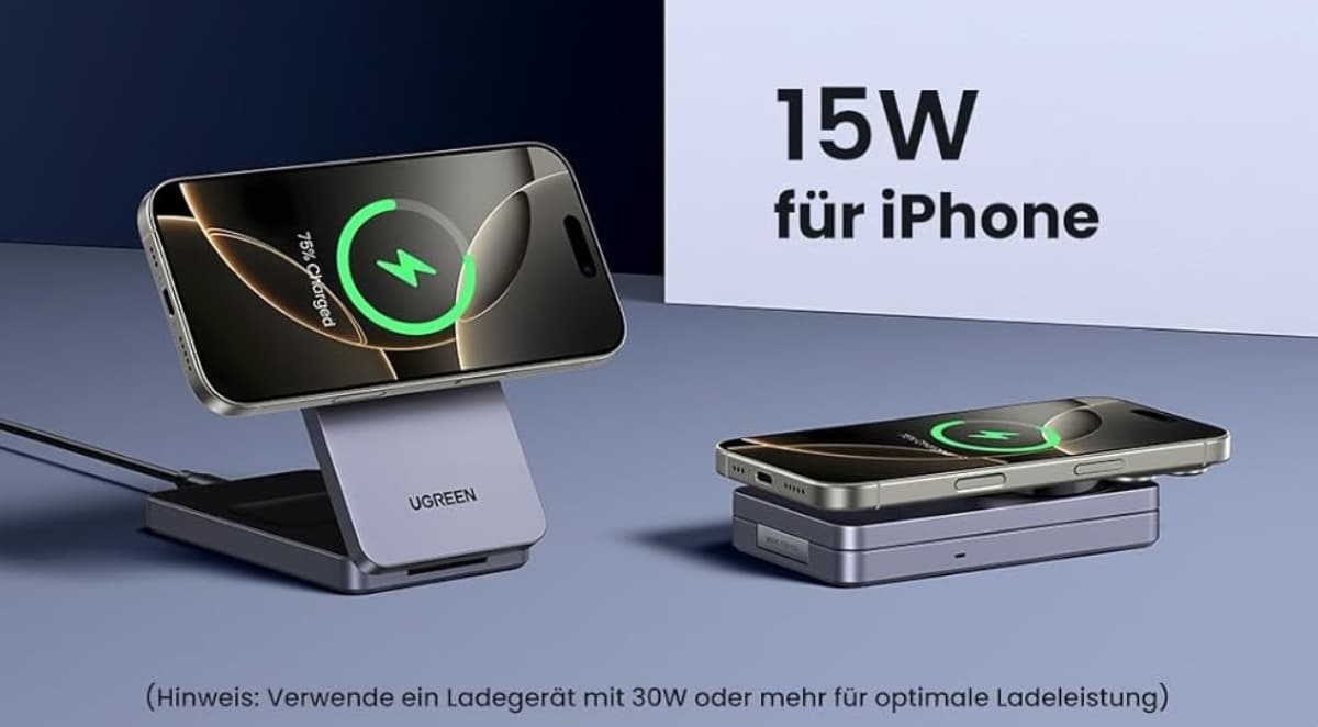 Die Ugreen MagFlow 2-in-1 Qi2-Ladestation (Amazon-Link) kann das iPhone und die AirPods mit Strom versorgen. Da man die Station einklappen kann, ist sie wunderbar für Reisen geeignet. Gleichzeitig könnt ihr die sonst 50 Euro teure Ladestation aktuell für nur 34,99 Euro kaufen. Alle weiteren Details könnt ihr meinem folgenden Testbericht entnehmen.