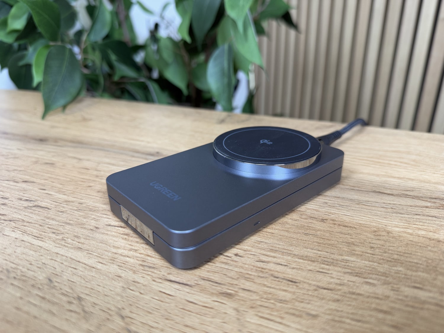 Mit nur 235 Gramm ist Ugreens Ladestation ziemlich leicht, und die Abmessungen von 116 x 66 x 24 Millimetern unterstreichen ebenfalls, dass sie auch auf Reisen eine gute Figur macht. Die Verarbeitung ist hochwertig, und es kommen Aluminium und Kunststoff zum Einsatz. Ein USB-C-Kabel liegt bei, lediglich ein Netzteil müsst ihr selbst bereitstellen.
