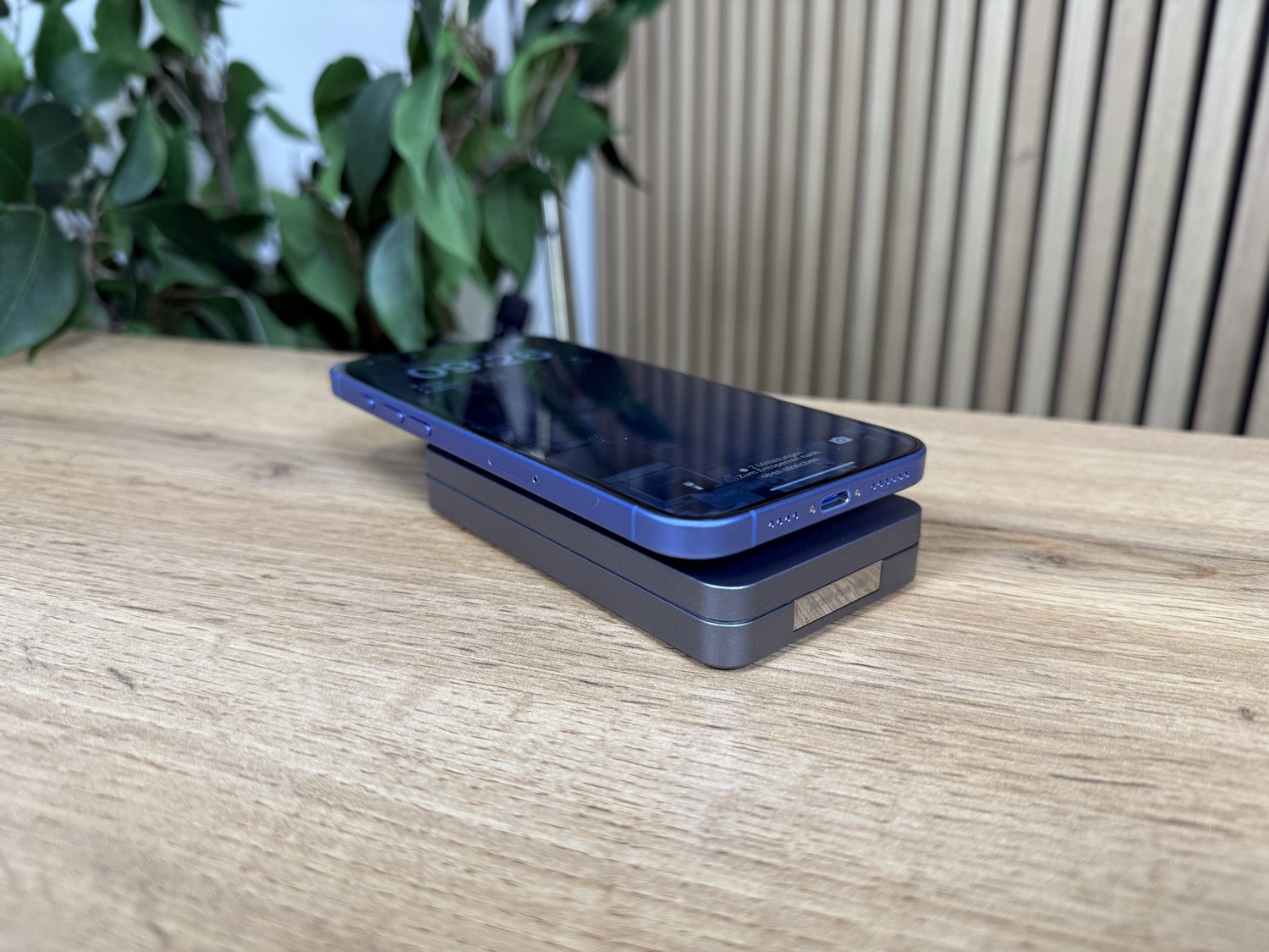 Die Details: Das iPhone hält magnetisch am Ladepuck, und das ausreichend sicher. Hat man den steilsten Blickwinkel eingestellt, fällt zwar nichts um, jedoch ist das Gewicht des iPhones so groß, dass die Station bei einem kleinen Schubser kippen kann. Das lässt sich verhindern, indem man sie fest auf dem Schreibtisch fixiert; dadurch geht jedoch die Portabilität verloren. Wenn man nur das iPhone aufladen möchte, kann man die Station zusammenklappen und das iPhone flach auflegen. Hüllen sind für die Ugreen-Ladestation kein Problem, jedoch ist eine MagSafe-Hülle notwendig, wenn man das iPhone mit Hülle anheften und laden möchte.