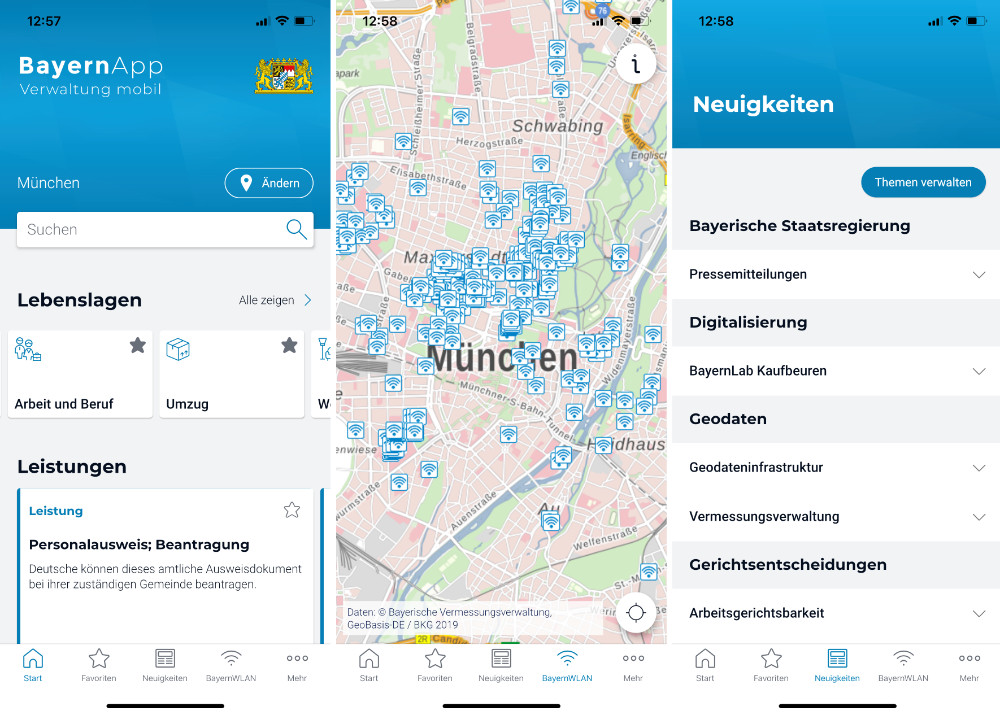 So heißt es von den Verantwortlichen auf einer Info-Website zur neuen BayernApp. Neben den Infos zu Verwaltungsdiensten, Behörden und sonstigen Einrichtungen, Neuigkeiten und der Karte mit kostenfreien BayernWLAN-Hotspots können Nutzer auch online behördliche Anfragen und Anträge starten. Unter anderem sind diese Services in der BayernApp verfügbar: