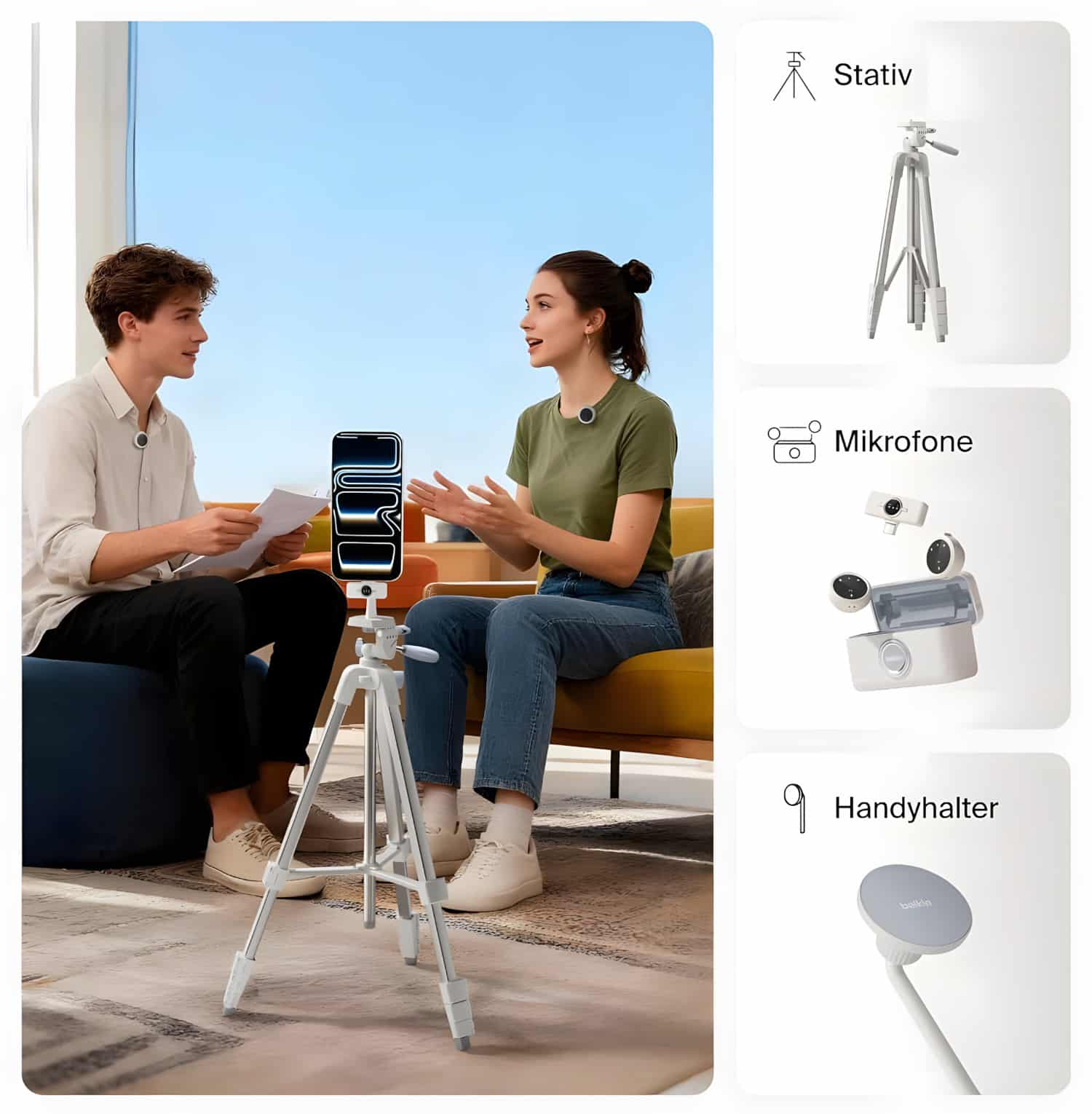 Ein zentrales Element des Kits ist ein drahtloses Mikrofonset, das aus zwei kompakten Mikrofonen besteht. Diese lassen sich magnetisch an Kleidung befestigen und verbinden sich über einen USB-C-Empfänger mit kompatiblen iPhones. Belkin gibt die Reichweite mit bis zu 100 Metern an. Die Aufnahmequalität beträgt 24 Bit bei 48 kHz, was besonders für klare Sprachaufnahmen optimiert ist. Ein mitgeliefertes Ladeetui verlängert die Laufzeit der Mikrofone und ermöglicht so längere Aufnahmesitzungen.