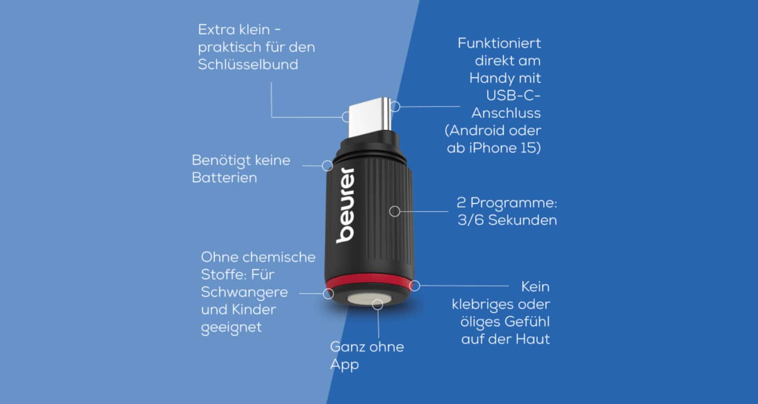 Der Beurer BiteX Go ist mit 4,35 × 1,45 Zentimetern ebenfalls sehr kompakt und lässt sich problemlos am Schlüsselbund befestigen. Im Gegensatz zum Heat it verzichtet Beurer auf eine App und nutzt das Smartphone lediglich als Stromquelle. Dabei ist die Anwendung simpel: Kappe aufdrehen, Beurer BiteX Go über USB-C anschließen und loslegen. Der Insektenstichheiler bietet dabei zwei Modi mit 3 oder 6 Sekunden, sodass die Behandlung auch bei Kindern möglich ist.
