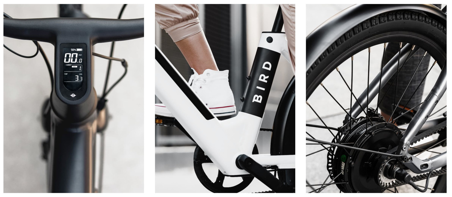Ähnlich wie auch beim VanMoof S3 gibt es auch beim Bird Bike einen sogenannten Boost-Button, der einen schnellen Geschwindigkeitsschub, beispielsweise bei Anstiegen oder beim Anfahren an einer Ampel, ermöglicht. Im Hinterrad ist für den Antrieb ein 250W-Motor von Bafang verbaut – die US-Version kommt sogar auf 500 Watt. Zudem gibt es einen Karbonriemen von Gates und ein austauschbarer 12,8 Amperestunden-Akku von LG, ebenso wie Scheibenbremsen von Radius CX7 am Vorder- und Hinterrad. Mit diesen Spezifikationen sollen bis zu 80 Kilometer an tretunterstütztem Fahren möglich sein.