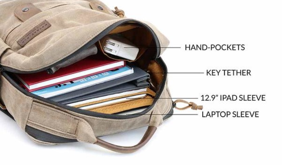 Außen lassen sich jeweils an der linken und rechten Seite Wasserflaschen deponieren – mit meiner 0,6l-Sigg-Aluflasche gab es dabei keinerlei Probleme. Des weiteren befinden sich an der Front ein großes Reißverschlussfach und zwei größere Einschübe, die mit einer magnetischen Lederklappe verschlossen werden. Besonders praktisch und bei Waterfield Designs-Produkten zum Standard geworden ist eine Auskleidung im Inneren mit hellem orangefarbenem Stoff, die es dem Nutzer deutlich erleichtert, in den Tiefen der Tasche Gegenstände wiederzufinden. Ebenfalls nützlich ist ein zweiter Reißverschluss an der Oberseite, der direkten Zugriff auf das Tablet- und Laptopfach gewährt – vor allem am Flughafen beim Sicherheitscheck ein großer Vorteil.