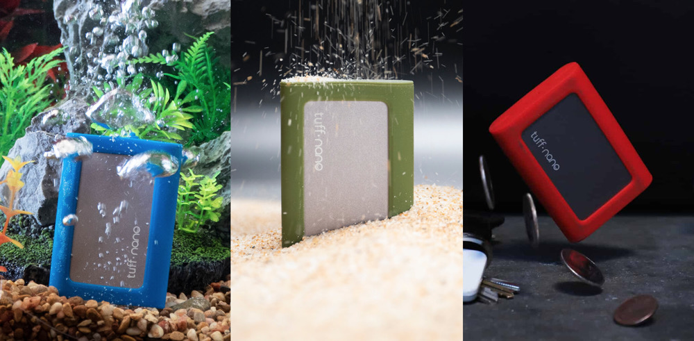 Auch die Maße der CalDigit Tuff Nano Plus eignen sich hervorragend für einen Einsatz auf Reisen oder im mobilen Büro. Die Tuff Nano Plus ist nur 10,19 x 5,44 x 1,45 cm groß und wiegt etwa 100 Gramm. Wer mit maximal 1 TB Speicher zurecht kommt, kann auch auf das Standardmodell zurückgreifen, das mit einer Länge von 7,59 statt 10,19 cm daher kommt und nur 74 Gramm wiegt. Die CalDigit Tuff Nano (Plus)-SSDs sind in vier verschiedenen Silikon-Bumper-Farben (Tomato Red, Olive Green, Royal Blue und Charcoal Black) zu Preisen ab 159 Euro im Webshop von CalDigit erhältlich. Das Tuff Nano-Standardmodell kann auch bei Amazon erworben werden.