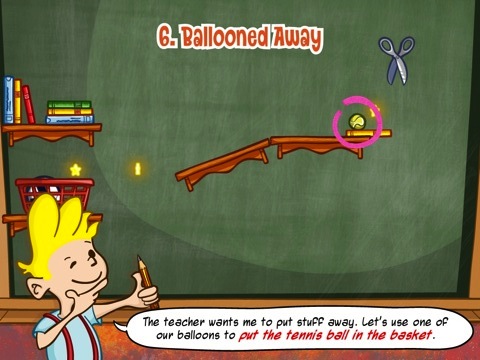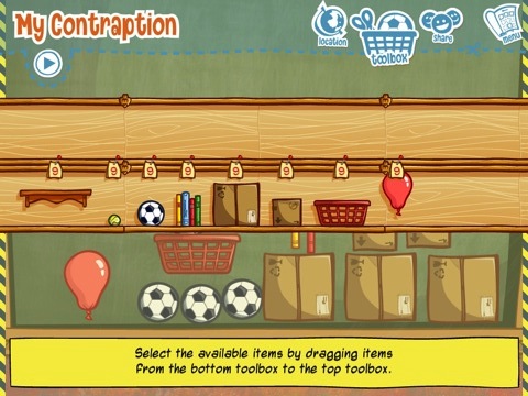 Casey, der kleine Junge mit den gelben Haaren, sagt euch was zu tun ist. So muss beispielsweise ein Ballon unter ein Regal befördert werden oder ein Ball in einen Korb. Dazu stehen verschiedene Möglichkeiten zur Verfügung. Am unteren Bildschirmrand befinden sich Objekte, die man im Level verbauen kann. Doch auch schon vorgegebene Objekte können benutzt werden, um das Level erfolgreich abzuschließen.