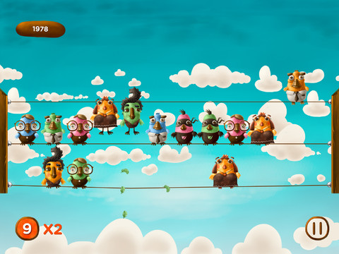 Bei Fur and Feathers handelt es sich wieder einmal um ein Match-3-Spiel. Auf drei Hochspannungsleitungen sitzen verschiedenfarbige Vögel, die von Leitung zu Leitung geschubst werden können. Dazu zieht man sie einfach mit dem Finger auf und lässt los – zusätzlich kann man mit einem Rechts-Links-Wisch die Vögel auf dem Seil hin und her schieben. Bei einer richtigen Kombination von drei gleichfarbigen Vögeln verschwinden diese und erhöhen den Punktestand.