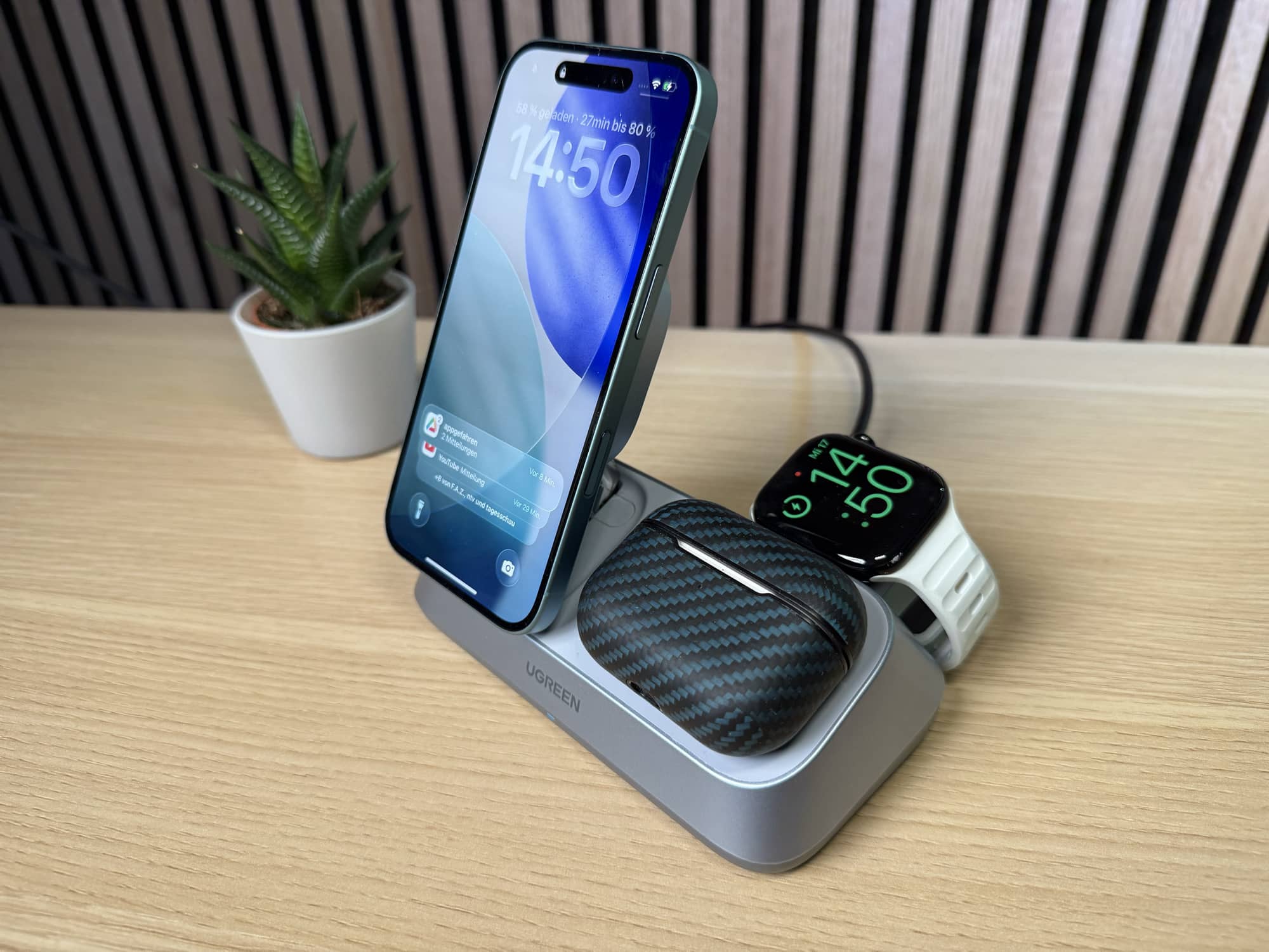 Im Test: Ugreen MagFlow 3-in-1 Desktop-Ladegerät mit Qi2 25W Lädt auch die Watch und die AirPods