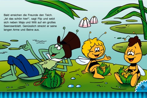 Wo wir gerade bei Soundeffekten sind: Die Biene Maja-App kommt mit einem Sprecher daher, der die Geschichte vorliest – falls das Mama oder Papa mal nicht können. Das Kind muss dann nur noch die Seiten umblättern, was ganz normal durch wischen über den Bildschirm funktioniert.