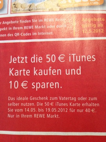 Ab Montag dem 14. Mai 2012 kann man bei REWE die 50 Euro iTunes-Karte für nur 40 Euro kaufen. Wer mitgerechnet hat, wird bemerkt haben, dass es sich also um 20 Prozent Rabatt handelt. Update: Das Angebot gibt es auch bei Kaufpark und Toom! (Danke für den Hinweis)