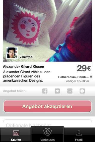 Wie es sich für einen ordentlichen Trödelmarkt gehört, kann man das Angebot sofort akzeptieren oder noch ein wenig handeln. Über eine entsprechende Eingabemaske kann man dem Verkäufer auch eine kurze Nachricht senden.