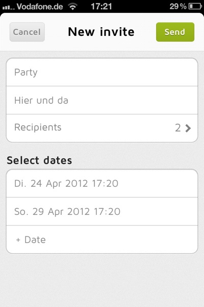 Nach der Installation muss man kurz seine E-Mail-Adresse bestätigen und kann dann direkt eine Veranstaltung planen. Man gibt Titel und Ort ein, danach kann man mehrere Termine eintragen (Datum und Uhrzeit), aus denen die Freunde später wählen können. Praktisch: Nutzer der App können die Daten direkt innerhalb der App einsehen, wer kein iPhone oder kein Invy hat, bekommt eine E-Mail zum Webportal.