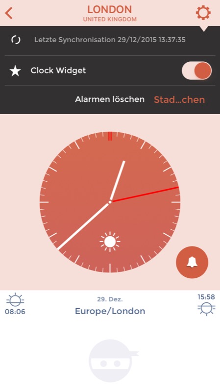 Für jeden eingebundenen Ort wird nicht nur die aktuelle Ortszeit angezeigt, sondern auch der örtliche Sonnenauf- und -untergang, das jeweilige Datum, ein Symbol für Tag oder Nacht, ein Landeskürzel („GB“, „DE“ etc.) sowie die Zeitzone. Um keinen Termin in einer Zeitzone zu verpassen, können individuelle Alarme für jeden Ort gesetzt werden, außerdem gibt es ein Widget für die Mitteilungszentrale, um die Uhrzeit für favorisierte Städte auf die Schnelle anzeigen zu lassen.