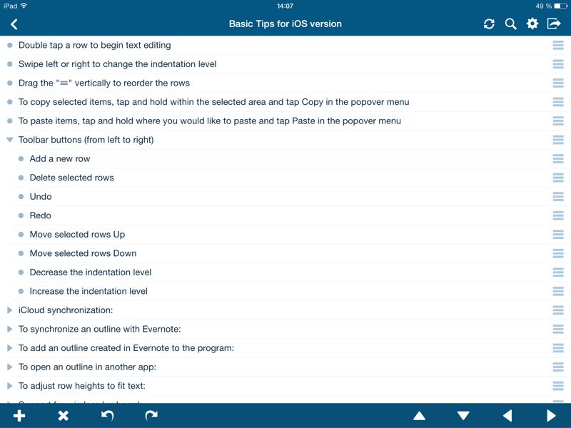 Besonders praktisch in Cloud Outliner ist das Drag-and-Drop-Feature, mit dem sich die Listenansicht beliebig verschieben und sortieren lassen. Kleine Kontrollkästchen erlauben es dem Nutzer, fertige Elemente abzuhaken. Entwürfe können nicht nur per iCloud auf alle Geräte synchronisiert, sondern auch im OPML-Format importiert bzw. exportiert und mit dem Evernote-Dienst verbunden werden. Für eine Weiterleitung per E-Mail steht ebenfalls das OPML- oder eine Plain Text-Version zur Verfügung.