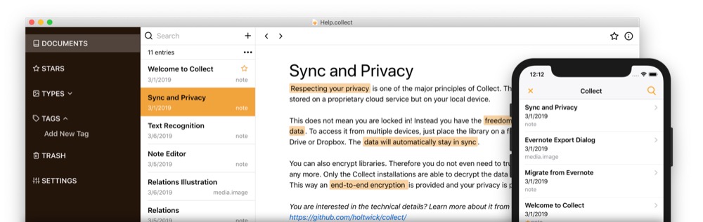Collect versteht sich mit zahlreichen Dokumenten-Typen, darunter Text, Audio-Files und PDFs, und erlaubt so eine sichere Aufbewahrung und Verwaltung von Projekten und Sammlungen jeglicher Art. Der Entwickler betont, dass die Daten lediglich lokal oder auch in einem Cloudspeicher nach Wahl, beispielsweise iCloud oder Dropbox, gesichert, synchronisiert und verschlüsselt werden. Collect für Mac kann ab macOS 10.11 geladen werden, die iOS-Variante der App ist ab iOS 11 nutzbar.