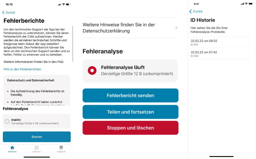 Ab sofort ist es möglich, in der Corona-Warn-App Fehleranalyse-Protokolle aufzuzeichnen, um beim Kontakt mit dem technischen Support der App besser gerüstet zu sein. Das Fehlerprotokoll lässt sich erstellen, um die Analyse möglicher Fehler zu erleichtern und zu einer schnelleren Fehlerbehebung beizutragen. In Version 2.2 steht diese Funktion im Bereich „App-Information“ unter „Fehlerberichte“ zur Verfügung. Dort kann dann der vorliegende Fehler über den Start-Button reproduziert werden, um ihn dann beim technischen Support einreichen zu können – natürlich anonymisiert und ohne jegliche Hinweise auf die Identität des Nutzers.