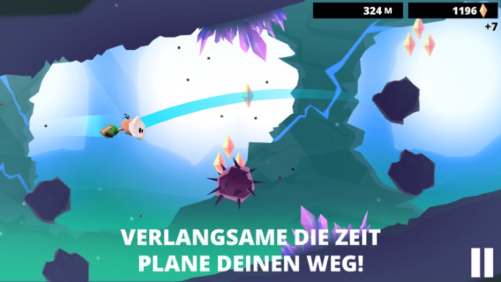 Eine Besonderheit von Danger Wave ist die Möglichkeit, durch längeres Gedrückthalten des Screens eine Zeitlupe auszulösen, um den nächsten Schritt der Fortbewegung besser planen zu können. Und dies ist oft auch bitter notwendig, denn überall lauern Gefahren in Form von Minen oder spitzen Dornen, mit denen man einen Kontakt um jeden Preis verhindern sollte. Unterwegs heißt es außerdem, kleine Diamanten auf dem Weg einzusammeln, um so im Spielverlauf weitere Charaktere freischalten zu können. Immer wieder gibt es auch Power-Ups zu entdecken, die kurzfristig bei der Flucht vor der großen heranrollenden Welle helfen.