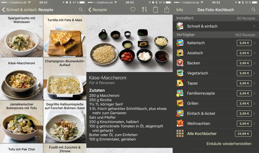 Zudem verschwinden alle bisherigen Rezepte-Sammlungen aus dem App Store und werden in die aktualisierte Haupt-App integriert. Aber keine Sorge: Solltet ihr ein Foto-Kochbuch bereits geladen und auf eurem Gerät installiert haben, wird genau das automatisch erkannt und die Inhalte im neuen Foto-Kochbuch kostenlos freigeschaltet. Alternativ könnt ihr die neun zusätzlichen Kochbücher mit jeweils mindestens 60 Rezepten für jeweils 3,49 Euro oder im Paket für 24,99 Euro freischalten. Eine faire Lösung für alle Nutzer.