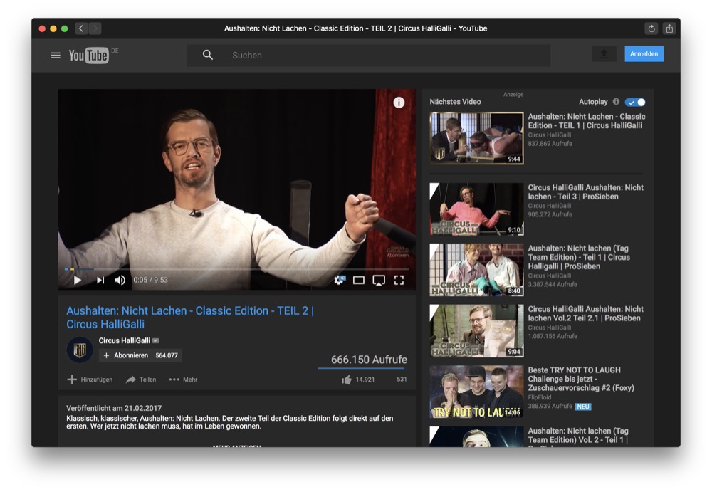 Die DeskApp ist wirklich sehr einfach gestrickt. Das Programm öffnet im eigenständigen Fenster die Browser-Version von YouTube und gewährt somit Zugriff auf alle wichtigen Funktionen. Das ist nichts besonderes, allerdings bietet die App noch ein paar Extras. So gibt es zum Beispiel ein dunkles Layout, die Möglichkeit, Musik via YouTube im Hintergrund zu hören sowie Benachrichtigungen am App-Icon, sobald ein neues Video hochgeladen wurde.