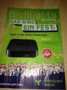 Bereits in diesem Monat gab es in den Mobilfunk-Shops von Mobilcom Debitel das Apple TV im Angebot. Während man aber im November 89,99 Euro bezahlt hat, wird der Preis im kommenden Monat noch besser: Im Flyer für Dezember ist das Apple TV für 79,99 Euro gelistet. Der Preis ist wirklich heiß, denn inklusive Versand zahlt man woanders 98 Euro – knapp 20 Prozent Rabatt auf ein aktuelles Apple-Produkt können sich schon sehen lassen.