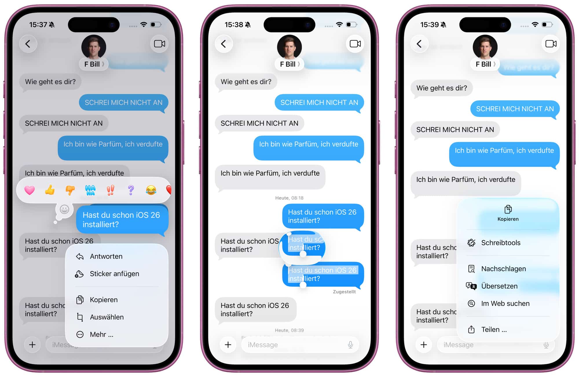 Mit iOS 26 gibt es endlich die Möglichkeit, Teile einer Nachricht anstatt die komplette Nachricht zu kopieren. Wenn du eine Adresse, URL oder Wörter kopieren willst, drücke lange auf die Nachricht und tippe auf „Auswählen“. Nun kannst du mit der Lupe die entsprechenden Textabschnitte markieren, kopieren und weiterleiten.