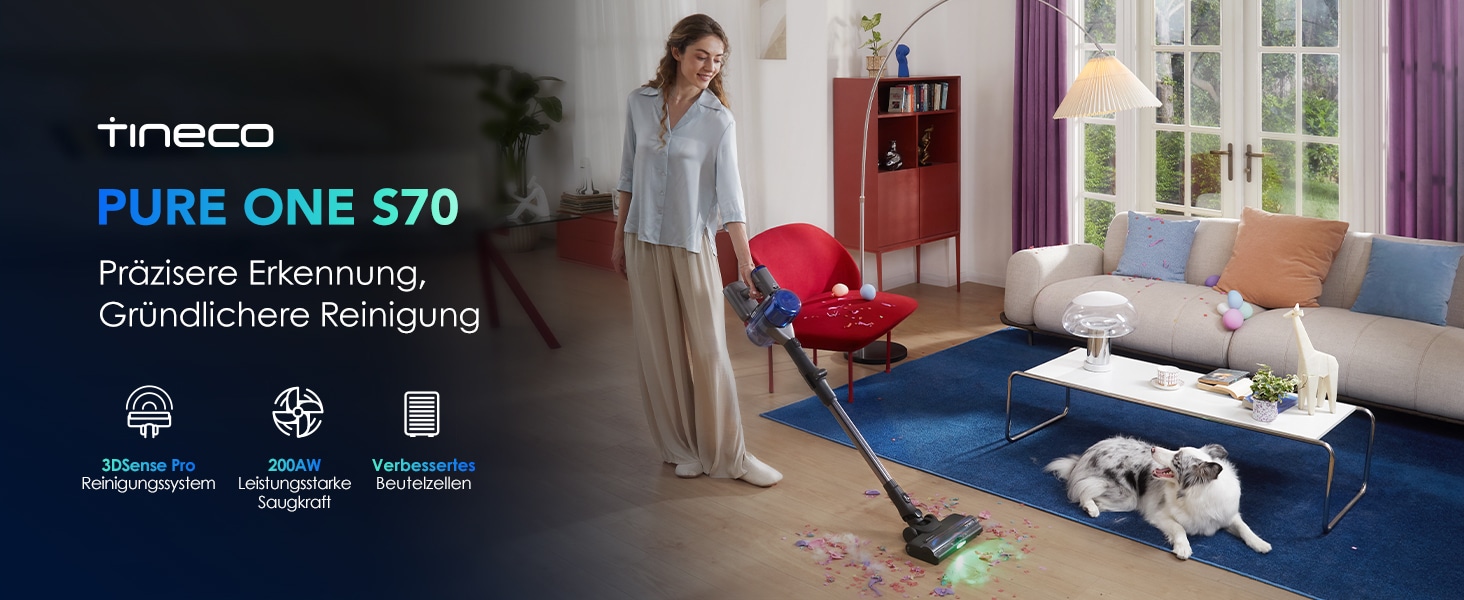 Tineco Pure ONE S70 Akku Staubsauger, 200 AW, LED, 3DSense Pro Reinigungssystem, bis...