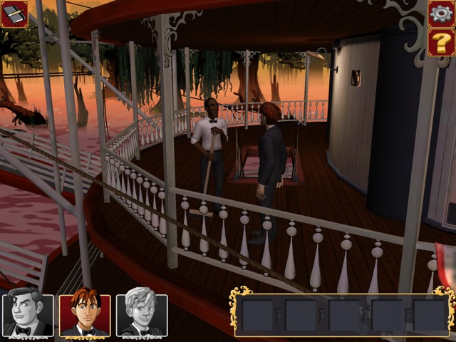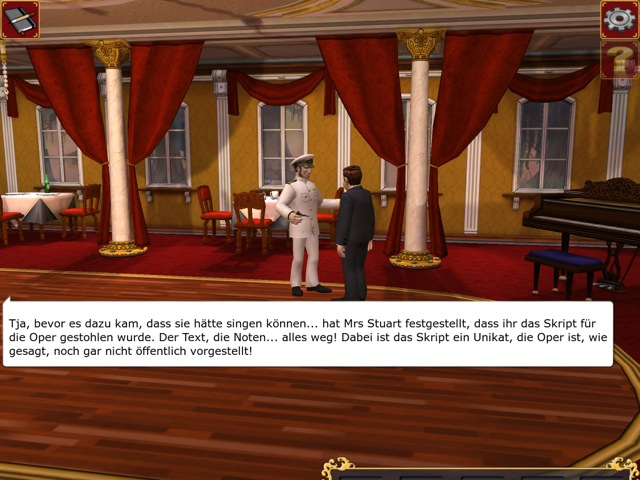 Natürlich lassen es sich die Drei nicht nehmen, und beginnen sofort mit ihren Recherchen. Gäste werden befragt, das Schiff erkundet, Hinweise und Beweismittel gesichert. In jedem Kapitel bekommt der Spieler eine Aufgabe gestellt, die es abzuarbeiten gilt. Gesteuert werden die drei Hauptfiguren über einfache Fingertipps auf dem Screen des Geräts. Über Buttons mit Porträts der drei Detektive ist es möglich, zwischen den Dreien auszuwähle. Objekte und Möbel können ebenfalls angetippt werden, so dass sich ein Optionsmenü öffnet, und man entscheiden kann, was man damit machen möchte.