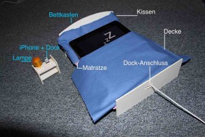 Ach und für Interessenten: Das Kopfkissen für das iPad besteht aus Watte, eingewickelt in Frischhaltefolie.. Und dann mit Stoff überklebt und zugetackert – kann nicht nähen. Die Matratze war ein Stück Karton, das mit einem rosa Stoff zugeklebt war.