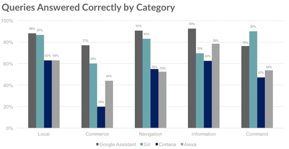 Die Methodik, mit der das Loup Ventures-Team dabei vorging, basiert auf zwei Bewertungs-Parametern: 1. Versteht der Sprachassistent, was gefragt wurde? und 2. Liefert der Assistent eine korrekte Antwort? Die Auswahl der insgesamt 800 Fragen, die allen vier Sprachassistenten gestellt wurden, stellten sich aus fünf unterschiedlichen Kategorien zusammen: Lokal („Wo ist die nächste Kaffeebar?), Handel („Kannst du weitere Papiertücher für mich bestellen?“), Navigation („Wie komme ich mit dem Bus ins Stadtzentrum?), Information („Gegen wen spielt Mannschaft X heute Abend?“) und Befehle („Erinnere mich daran, heute um 14 Uhr Steve anzurufen“).