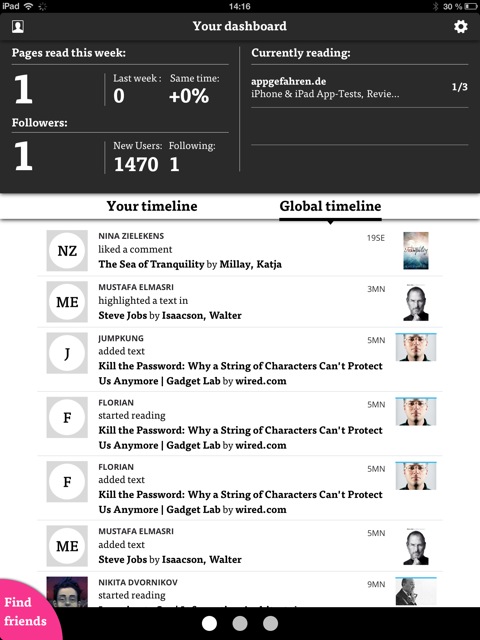 So kann man nicht nur Freunden folgen, sondern auch Personen aus aller Welt. Hier gibt es viel zu entdecken, außerdem sieht man zum Beispiel, was andere Personen lesen – natürlich sind diese Freigaben optional, dotdotdot kann weiterhin auch nur für private Zwecke genutzt werden.