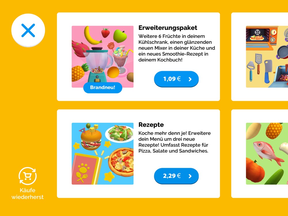 In der Gratis-Version von Dr. Panda Restaurant 3 ist die Nutzung eingeschränkt, es stehen nur eine Hand voll Gerichte und Zutaten bereit, weitere müssen per In-App-Kauf erworben werden. Und darauf macht die App auch direkt zum Start aufmerksam. Überall prangern die Einkaufswagen-Symbole, die zeigen, dass man doch bitte die Inhalte freischalten sollte. Die Vollversion kostet aktuell 5,49 Euro, zudem gibt es kleinere Inhalts-Pakete mit neuen Rezepten oder Zutaten für 1,09 Euro bzw. 2,29 Euro.