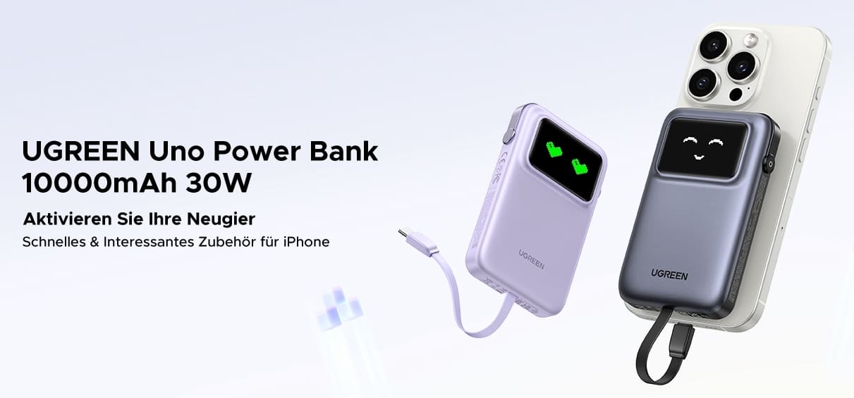 Die Ugreen Uno Powerbank mit 10.000 mAh (Amazon-Link) ist schon deutlich kleiner und portabler und bietet sogar ein integriertes USB-C-Kabel. Die genauen Abmessungen liegen bei 116 x 71 x 22 Millimeter, das Gewicht bei leichten 330 Gramm. Das USB-C-Kabel liefert 30 Watt, wobei zusätzlich je ein weiterer USB-C- und USB-A-Anschluss zur Verfügung stehen. Das kleine Display zeigt mit Emoji-Gesichtern den Ladestatus an.